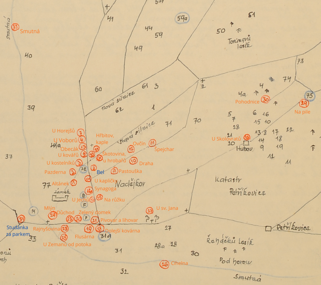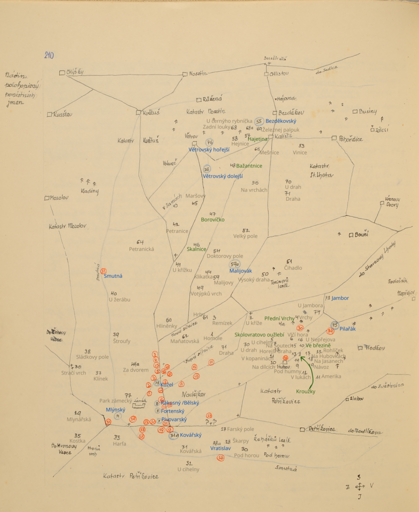Stránka Místní jména uvádí názvy pozemků u dalších nadějkovský osad, jak je zaznamenal řídící učitel Čeněk Bohuslávek ve dvacátých letech 20. století.